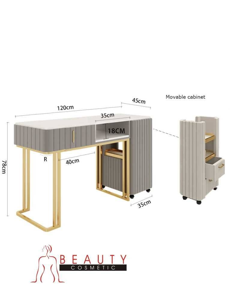 Masa de manichiura profesionala cu un design elegant si o constructie robusta ce confera o rezistenta indelungata. Dotata cu un dulapior mobil care se manevreaza usor cu ajutorul a 4 rotile. Blatul este din piatra sinterizata, iar cadrul este din metal in culoarea auriu.